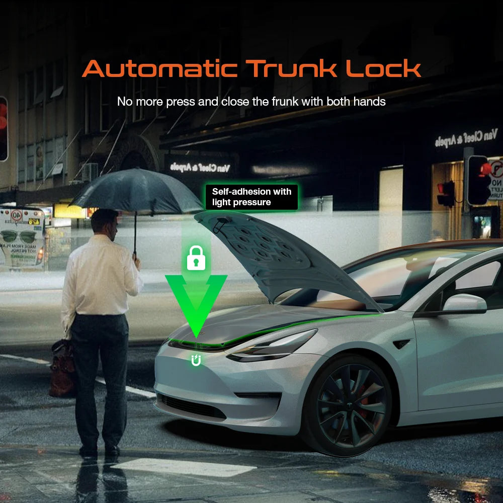 Say goodbye to pressing down on your Tesla’s front trunk to close it. With this Automatic Front Trunk Closer, your frunk closes smoothly and securely with just a touch, no pushing, slamming, or worrying about damaging the hood.